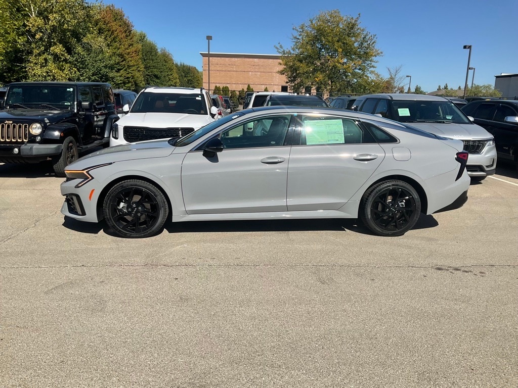This K5 is well equipped with K5 GT-Line, 4D Sedan, I4, 8-Speed Automatic, FWD, Wolf Gray, Black SynTex Seating Material, ABS brakes, Active Cruise Control, Alloy wheels, Electronic Stability Control, Front dual zone A/C, Heated door mirrors, Heated Front Bucket Seats, Heated front seats, Illuminated entry, Low tire pressure warning, Navigation System, Remote keyless entry, Traction control, 4-Wheel Disc Brakes, 6 Speakers, Air Conditioning, AM/FM radio: SiriusXM, Auto High-beam Headlights, Automatic temperature control, Brake assist, Bumpers: body-color, Delay-off headlights, Driver door bin, Driver vanity mirror, Dual front impact airbags, Dual front side impact airbags, Emergency communication system: Kia Connect (includes 1 year free trial), Four wheel independent suspension, Front anti-roll bar, Front Bucket Seats, Front Center Armrest, Front fog lights, Front reading lights, Fully automatic headlights, Heated steering wheel, Knee airbag, Leather Shift Knob, Leather steering wheel, Occupant sensing airbag, Outside temperature display, Overhead airbag, Overhead console, Panic alarm, Passenger door bin, Passenger vanity mirror, Power door mirrors, Power driver seat, Power steering, Power windows, Radio data system, Radio: AM/FM Audio System, Rear anti-roll bar, Rear seat center armrest, Rear side impact airbag, Rear window defroster, Security system, Speed control, Speed-sensing steering, Split folding rear seat, Sport steering wheel, Steering wheel mounted audio controls, Tachometer, Telescoping steering wheel, Tilt steering wheel, Trip computer, Turn signal indicator mirrors, Variably intermittent wipers, and Wheels: 18" x 7.5J Gloss Black Machined Finish Alloy.