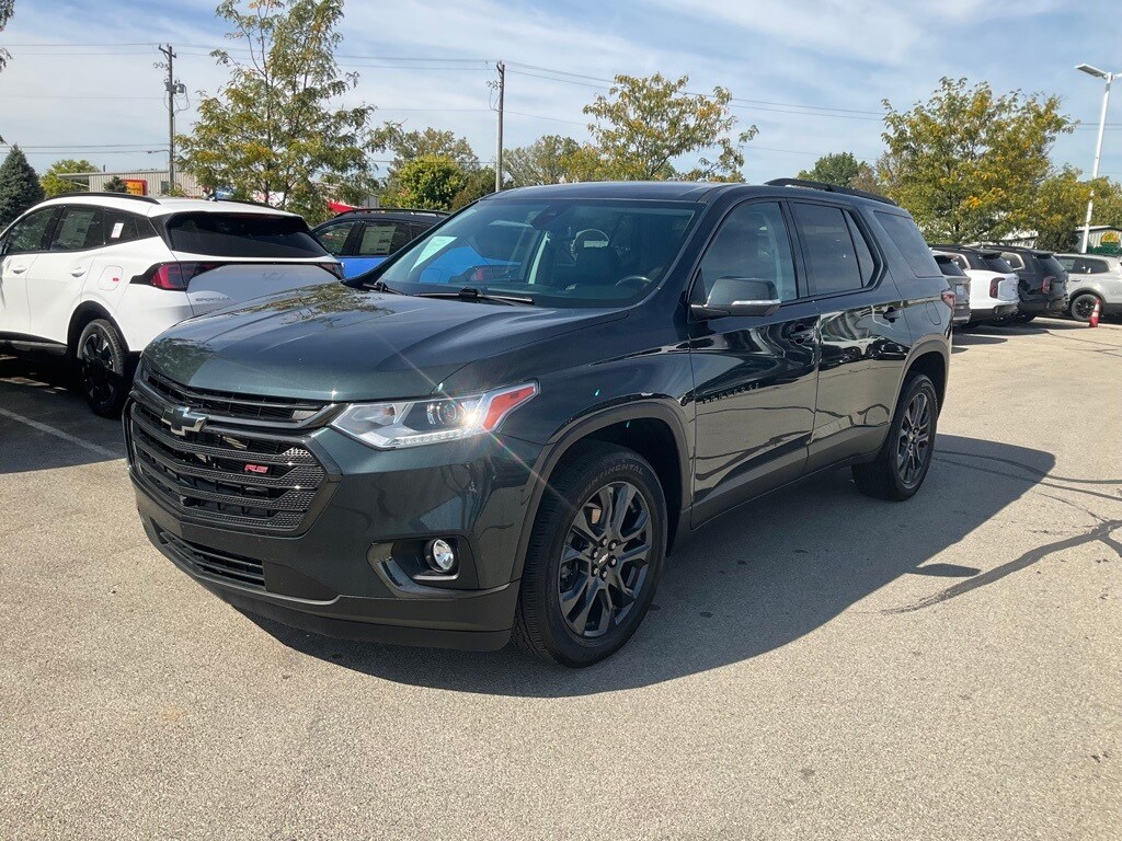 This Traverse is well equipped with Preferred Equipment Group 2LT (Gloss Black Emblem Kit (LPO)), Trailering Equipment (Heavy-Duty Cooling System, Hitch Guidance w/Hitch View, and Trailering Assist Guidelines), Traverse RS, 4D Sport Utility, 3.6L V6 SIDI VVT, 9-Speed Automatic, FWD, Graphite Metallic, Black Leather, 7-Passenger Seating (2-2-3 Seating Configuration), Heated front seats, Heated steering wheel, Navigation System, Power Liftgate, 10 Speakers, 3.49 Axle Ratio, 3rd row seats: split-bench, 4-Wheel Disc Brakes, ABS brakes, Air Conditioning, Alloy wheels, AM/FM radio: SiriusXM with 360L, Apple CarPlay/Android Auto, Auto High-beam Headlights, Auto-dimming Rear-View mirror, Automatic temperature control, Bose Premium 10-Speaker Audio System Feature, Brake assist, Bumpers: body-color, Compass, Delay-off headlights, Driver door bin, Driver vanity mirror, Dual front impact airbags, Dual front side impact airbags, Electronic Stability Control, Emergency communication system: OnStar and Chevrolet connected services capable, Four wheel independent suspension, Front anti-roll bar, Front Bucket Seats, Front Center Armrest, Front dual zone A/C, Front fog lights, Front reading lights, Fully automatic headlights, Garage door transmitter, Heated door mirrors, High-Intensity Discharge Headlights, Illuminated entry, Leather steering wheel, Leather-Appointed Seat Trim, Low tire pressure warning, Occupant sensing airbag, Outside temperature display, Overhead airbag, Overhead console, Panic alarm, Passenger door bin, Passenger vanity mirror, Power door mirrors, Power driver seat, Power passenger seat, Power steering, Power windows, Premium audio system: Chevrolet MyLink, Radio data system, Radio: Chevrolet Infotainment 3 Premium System, Rear air conditioning, Rear anti-roll bar, Rear reading lights, Rear window defroster, Rear window wiper, Remote keyless entry, Roof rack: rails only, Security system, SiriusXM w/360L, Speed control, Speed-sensing steering, Spoiler, Steering wheel mounted audio controls, Tachometer, Telescoping steering wheel, Tilt steering wheel, Traction control, Trip computer, Turn signal indicator mirrors, Variably intermittent wipers, Voltmeter, and Wheels: 20" Dark Android Painted Aluminum.