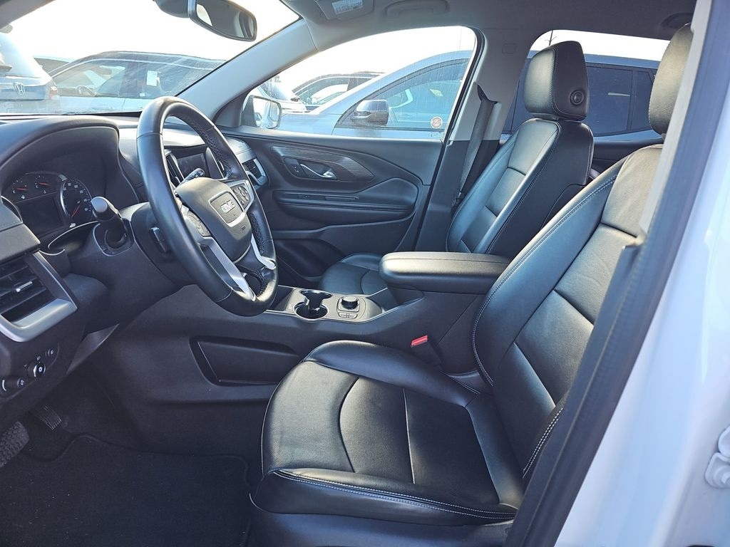 This Terrain is well equipped with Preferred Equipment Group 4SA, License Plate Front Mounting Package, Terrain SLT, 4D Sport Utility, 1.5L DOHC, 9-Speed Automatic, AWD, Summit White, Black Leather, 2 USB Data Ports, 2 USB Data Ports w/SD Card Reader, 3.47 Final Drive Axle Ratio, 4-Wheel Disc Brakes, 6 Speakers, 6-Speaker Audio System Feature, 6-Way Power Front Passenger Seat, 8-Way Power Driver Seat Adjuster, ABS brakes, Air Conditioning, Alloy wheels, AM/FM radio: SiriusXM, Auto High-beam Headlights, Auto-dimming Rear-View mirror, Automatic temperature control, Bluetooth® For Phone, Brake assist, Bumpers: body-color, Compass, Delay-off headlights, Driver & Front Passenger Heated Seats, Driver door bin, Driver vanity mirror, Dual front impact airbags, Dual front side impact airbags, Electronic Stability Control, Emergency communication system: OnStar and GMC connected services capable, Four wheel independent suspension, Front anti-roll bar, Front Bucket Seats, Front Center Armrest, Front dual zone A/C, Front fog lights, Front Passenger 2-Way Power Lumbar, Front reading lights, Fully automatic headlights, Garage door transmitter, Heated door mirrors, Heated front seats, Heated steering wheel, Illuminated entry, Low tire pressure warning, Memory seat, Occupant sensing airbag, Outside temperature display, Overhead airbag, Overhead console, Panic alarm, Passenger door bin, Passenger vanity mirror, Perforated Leather-Appointed Seat Trim, Power door mirrors, Power Driver Lumbar Control, Power driver seat, Power Liftgate, Power passenger seat, Power steering, Power windows, Radio data system, Radio: GMC Infotainment Audio System w/8" Display, Rear anti-roll bar, Rear seat center armrest, Rear window defroster, Rear window wiper, Remote keyless entry, Roof rack: rails only, Security system, SiriusXM, Speed control, Speed-sensing steering, Split folding rear seat, Spoiler, Steering wheel mounted audio controls, Tachometer, Telescoping steering wheel, Tilt steering wheel, Traction control, Trip computer, Turn signal indicator mirrors, Variably intermittent wipers, Wheels: 18" x 7" Silver Painted Aluminum, and Wireless Apple CarPlay/Wireless Android Auto.