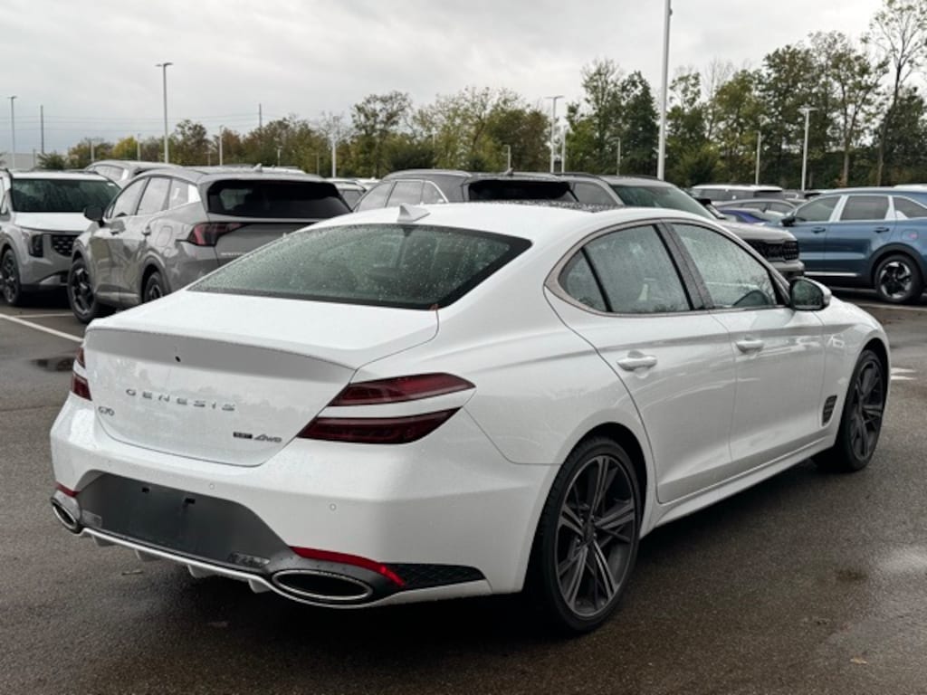 Alta White 2025 Genesis G70 3.3T Sport Advanced AWD 8-Speed Automatic 3.3L V6 DGI DOHC 24V Air Conditioning, Alloy wheels, Auto High-beam Headlights, Auto-dimming Rear-View mirror, Delay-off headlights, Front dual zone A/C, Front reading lights, Heated front seats, Heated steering wheel, Navigation System, Option Group 01, Outside temperature display, Passenger vanity mirror, Power driver seat, Power moonroof, Rear reading lights, Rear window defroster, Reversible Cargo Tray, Steering wheel memory, Ventilated front seats.