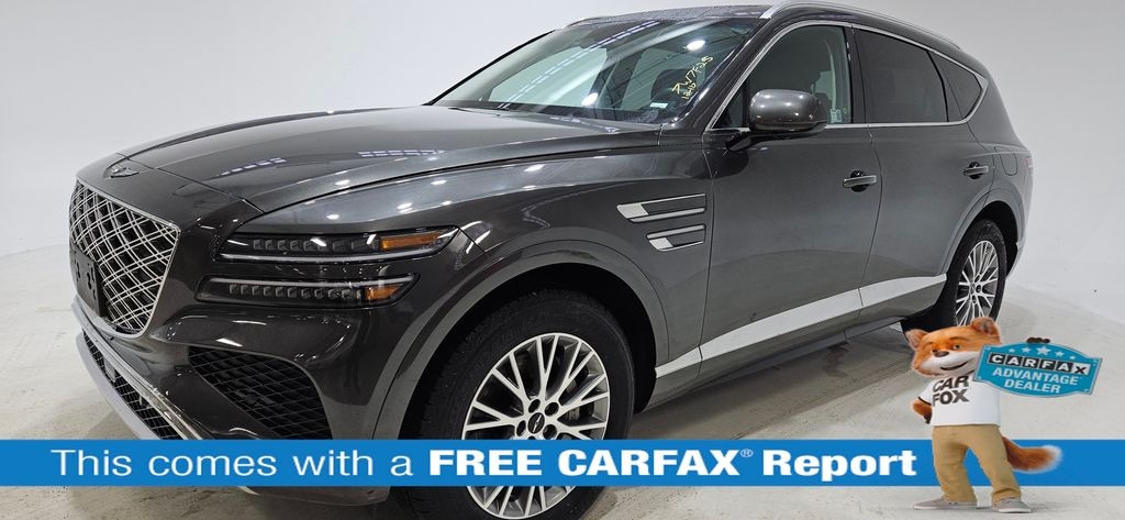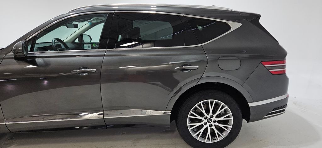 This GV80 is well equipped with Option Group 01, Navigation System, Wheels: 19" x 8.5J Medium Metallic Gray Alloy, 12 Speakers, 4-Wheel Disc Brakes, ABS brakes, Air Conditioning, Alloy wheels, AM/FM radio: SiriusXM, Anti-whiplash front head restraints, Auto High-beam Headlights, Auto tilt-away steering wheel, Auto-dimming door mirrors, Auto-dimming Rear-View mirror, Auto-leveling suspension, Automatic temperature control, Brake assist, Bumpers: body-color, Compass, Delay-off headlights, Driver door bin, Driver vanity mirror, Dual front impact airbags, Dual front side impact airbags, Electronic Stability Control, Emergency communication system: Genesis Connected Services, Exterior Parking Camera Rear, Four wheel independent suspension, Front anti-roll bar, Front Bucket Seats, Front Center Armrest, Front dual zone A/C, Front reading lights, Fully automatic headlights, Garage door transmitter: HomeLink, Heated door mirrors, Heated Front Bucket Seats, Heated front seats, Illuminated entry, Knee airbag, Leather steering wheel, Leatherette Seating Surfaces, Low tire pressure warning, Memory seat, Occupant sensing airbag, Outside temperature display, Overhead airbag, Overhead console, Panic alarm, Passenger door bin, Passenger vanity mirror, Power door mirrors, Power driver seat, Power Liftgate, Power passenger seat, Power steering, Power windows, Radio data system, Radio: AM/FM/SiriusXM/HD, Rain sensing wipers, Rear air conditioning, Rear anti-roll bar, Rear reading lights, Rear seat center armrest, Rear side impact airbag, Rear window defroster, Rear window wiper, Remote keyless entry, Security system, Speed control, Speed-sensing steering, Speed-Sensitive Wipers, Split folding rear seat, Spoiler, Steering wheel memory, Steering wheel mounted audio controls, Tachometer, Telescoping steering wheel, Tilt steering wheel, Traction control, Trip computer, Turn signal indicator mirrors, and Variably intermittent wipers.