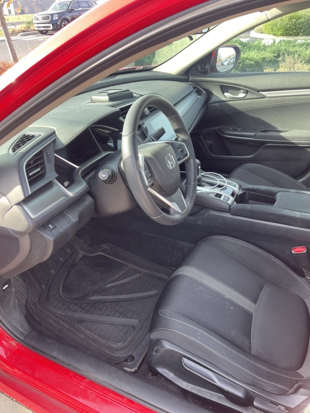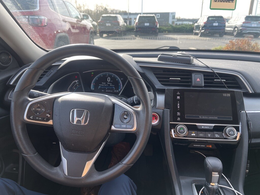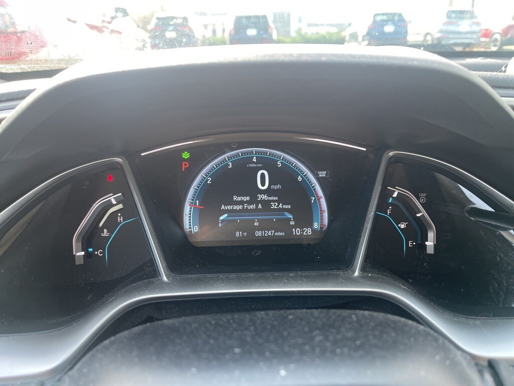 This Civic is well equipped with Black w/Leather Seat Trim, 16" Alloy Wheels, 4-Wheel Disc Brakes, 8 Speakers, ABS brakes, Air Conditioning, Alloy wheels, AM/FM radio, Apple CarPlay/Android Auto, Automatic temperature control, Brake assist, Bumpers: body-color, Cloth Seat Trim, Compass, Delay-off headlights, Driver door bin, Driver vanity mirror, Dual front impact airbags, Dual front side impact airbags, Electronic Stability Control, Emergency communication system: HondaLink Assist, Exterior Parking Camera Rear, Four wheel independent suspension, Front anti-roll bar, Front Bucket Seats, Front Center Armrest, Front reading lights, Fully automatic headlights, Heated door mirrors, Illuminated entry, Low tire pressure warning, Occupant sensing airbag, Outside temperature display, Overhead airbag, Panic alarm, Passenger door bin, Passenger vanity mirror, Power door mirrors, Power moonroof, Power steering, Power windows, Radio data system, Radio: 180-Watt AM/FM Audio System, Rear anti-roll bar, Rear seat center armrest, Rear window defroster, Reclining Front Bucket Seats, Remote keyless entry, Security system, Speed control, Speed-sensing steering, Speed-Sensitive Wipers, Split folding rear seat, Steering wheel mounted audio controls, Tachometer, Telescoping steering wheel, Tilt steering wheel, Traction control, Trip computer, and Variably intermittent wipers.