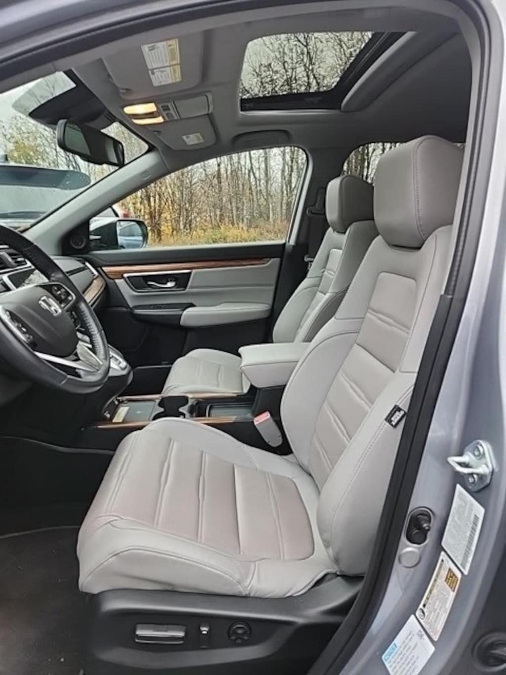 This CR-V Hybrid is well equipped with 2.0L I4 DOHC 16V, 3.89 Axle Ratio, 4-Wheel Disc Brakes, 9 Speakers, ABS brakes, Adaptive Cruise Control: Adaptive Cruise Control (ACC) with Low-Speed Follow, Air Conditioning, Alloy wheels, AM/FM radio: SiriusXM, Apple CarPlay/Android Auto, Auto High-beam Headlights, Auto-dimming Rear-View mirror, Automatic temperature control, Blind Spot Information (BSI) System warning, Brake assist, Bumpers: body-color, Compass, Delay-off headlights, Driver door bin, Driver vanity mirror, Dual front impact airbags, Dual front side impact airbags, Electronic Stability Control, Exterior Parking Camera Rear, Forward collision: Collision Mitigation Braking System (CMBS) + FCW mitigation, Four wheel independent suspension, Front anti-roll bar, Front Bucket Seats, Front Center Armrest, Front dual zone A/C, Front fog lights, Front reading lights, Garage door transmitter: HomeLink, Heated door mirrors, Heated Front Bucket Seats, Heated front seats, Heated steering wheel, Illuminated entry, Leather Seat Trim, Low tire pressure warning, Memory seat, Navigation system: Honda Satellite-Linked Navigation System, Occupant sensing airbag, Outside temperature display, Overhead airbag, Overhead console, Panic alarm, Passenger door bin, Passenger vanity mirror, Power door mirrors, Power driver seat, Power Liftgate, Power moonroof, Power passenger seat, Power steering, Power windows, Radio data system, Radio: 330-Watt AM/FM/HD/SiriusXM Prem Audio Sys, Rain sensing wipers, Rear anti-roll bar, Rear seat center armrest, Rear window defroster, Rear window wiper, Remote keyless entry, Roof rack: rails only, Security system, Speed control, Speed-sensing steering, Speed-Sensitive Wipers, Split folding rear seat, Spoiler, Steering wheel mounted audio controls, Telescoping steering wheel, Tilt steering wheel, Traction control, Trip computer, Turn signal indicator mirrors, Variably intermittent wipers, and Wheels: 19" Machine-Finished Alloy w/Gray Inserts.