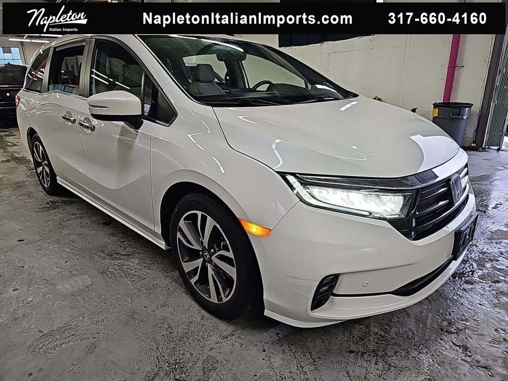 This Odyssey is well equipped with Apple CarPlay/Android Auto, Blind Spot Information (BSI) System warning, Heated front seats, Lane departure: Lane Keeping Assist System (LKAS) active, Navigation system: Honda Satellite-Linked Navigation System, Power Liftgate, Power moonroof, Reclining 3rd row seat, 3.61 Axle Ratio, 3rd row seats: split-bench, 4-Wheel Disc Brakes, 7 Speakers, A/V remote: CabinControl, ABS brakes, Adaptive Cruise Control: Adaptive Cruise Control (ACC) with Low-Speed Follow, Air Conditioning, Alloy wheels, AM/FM radio: SiriusXM, Anti-whiplash front head restraints, Auto High-beam Headlights, Auto-dimming Rear-View mirror, Automatic temperature control, Brake assist, Bumpers: body-color, CD player, Compass, Delay-off headlights, Driver door bin, Driver vanity mirror, Driver's Seat Mounted Armrest, Dual front impact airbags, Dual front side impact airbags, DVD-Audio, Electronic Stability Control, Emergency communication system: HondaLink, Exterior Parking Camera Rear, Four wheel independent suspension, Front anti-roll bar, Front Bucket Seats, Front dual zone A/C, Front fog lights, Front reading lights, Fully automatic headlights, Garage door transmitter: HomeLink, Headphones, Heated door mirrors, Heated Front Bucket Seats, Illuminated entry, Knee airbag, Leather Seat Trim, Leather steering wheel, Low tire pressure warning, Memory seat, Occupant sensing airbag, Outside temperature display, Overhead airbag, Overhead console, Panic alarm, Passenger door bin, Passenger seat mounted armrest, Passenger vanity mirror, Power door mirrors, Power driver seat, Power passenger seat, Power steering, Power windows, Radio data system, Radio: 160-Watt AM/FM/HD/SiriusXM Audio System, Rear air conditioning, Rear anti-roll bar, Rear audio controls, Rear reading lights, Rear seat center armrest, Rear window defroster, Rear window wiper, Remote keyless entry, Security system, Speed control, Speed-sensing steering, Speed-Sensitive Wipers, Split folding rear seat, Spoiler, Steering wheel mounted audio controls, Tachometer, Telescoping steering wheel, Tilt steering wheel, Traction control, Trip computer, Turn signal indicator mirrors, Variably intermittent wipers, and Wheels: 19" Machine-Finished Alloy.