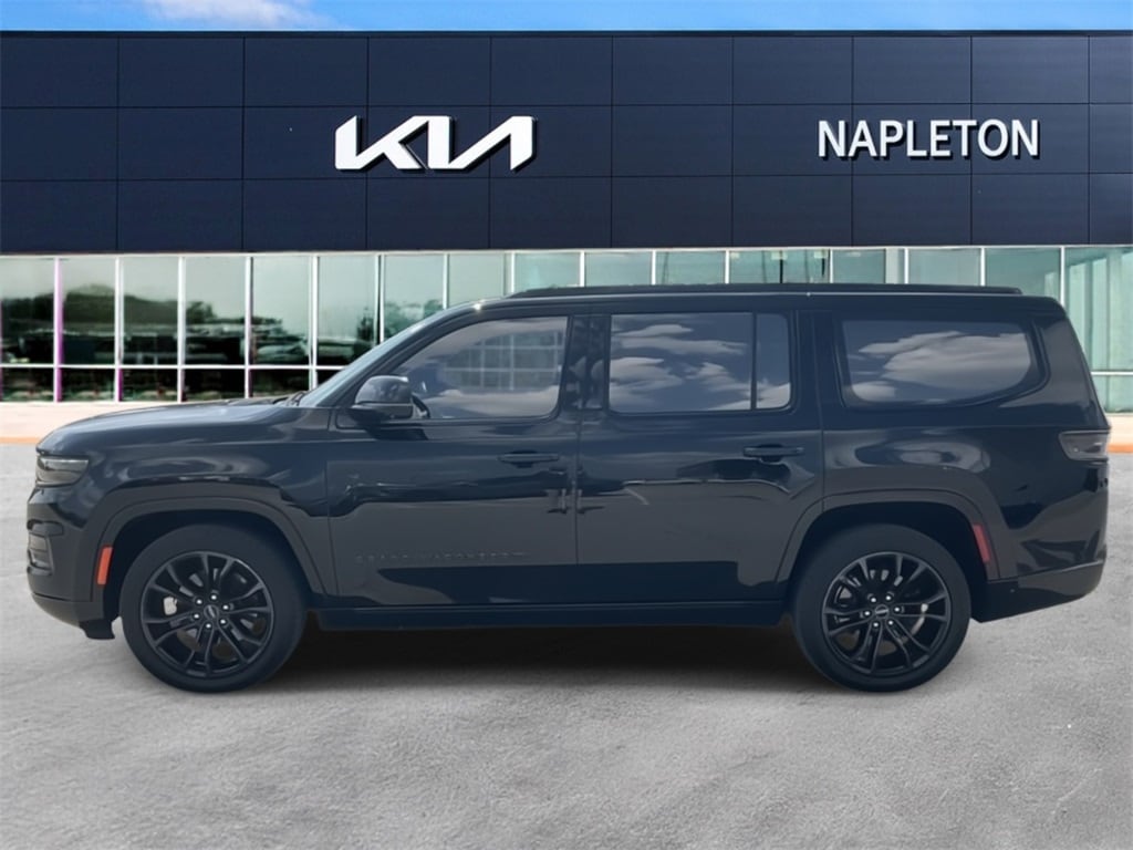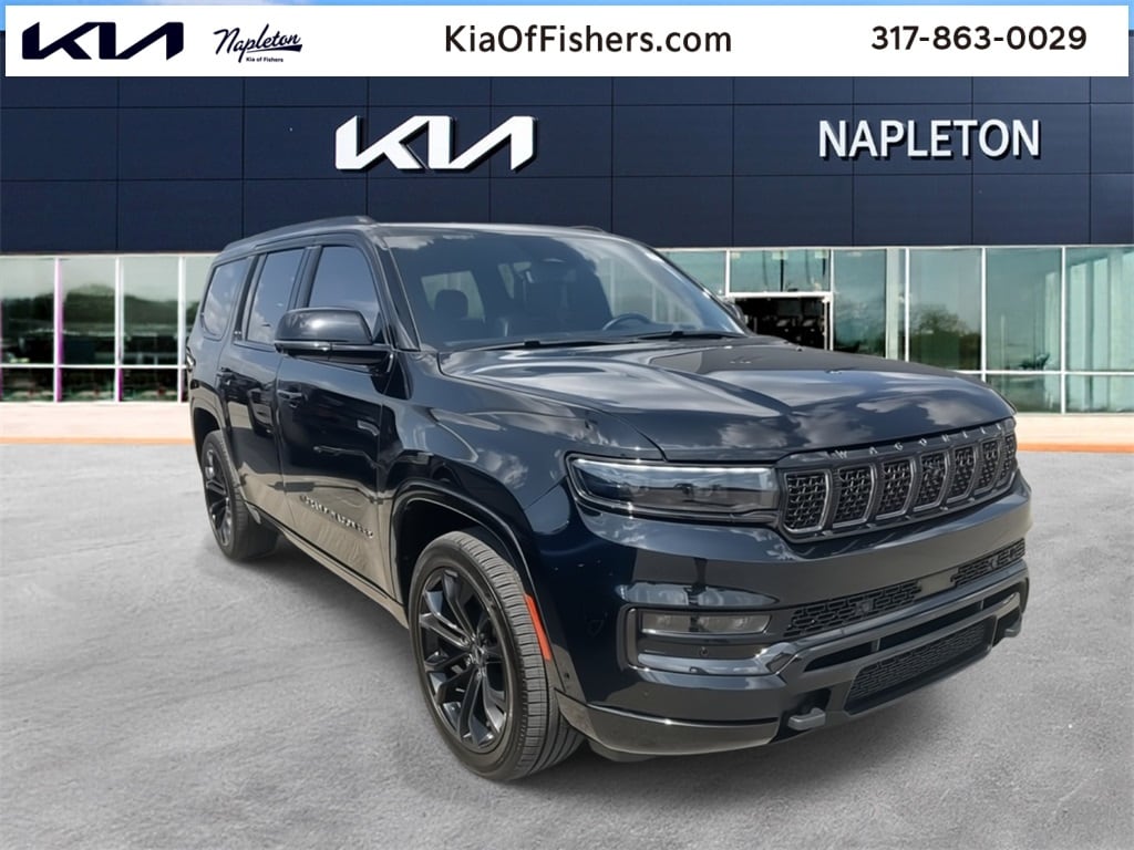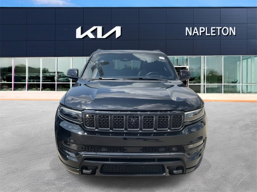 This Grand Wagoneer is well equipped with Convenience Group III (Active Driving Assist System, Advanced Security Alert System, Interior Rear Facing Camera, Intersection Collision Assist System, and Night Vision/Pedestrian-Animal Detection), HD Trailer Tow Package (Heavy-Duty Engine Cooling, Removable Rear Tow Hook, Trailer Brake Control, Trailer Hitch Line-Up Assist, and Trailer Hitch Zoom), Obsidian Appearance Package, Quick Order Package 23T Obsidian (23 Speaker McIntosh Reference Audio System, Adjustable Roof Rail Crossbars, Black Interior Accents, Black Roof, Cargo Cover, Front Console Cooler, Front Passenger Interactive Display, Gloss Black Upper & Lower DLO Molding, Piano Black Exterior Accents, Premium Tinted Glass, Ventilated Rear Seats, and Wheels: 22" x 9.0" Tinted Polished w/Black Insert), Rear Seat Video Group 1 (Amazon Fire TV Built-In, Seatback Video Screens, and Video USB Port), Two Tone Paint Group, Grand Wagoneer Series II, 4D Sport Utility, 6.4L V8, 8-Speed Automatic, 4WD, Diamond Black Crystal Pearlcoat, Global Black w/Premium Leather Trimmed Bucket Seats, Navigation System, Power Liftgate, Power moonroof, 19 Speakers, 3.92 Rear Axle Ratio, 3rd row seats: bench, 4-Wheel Disc Brakes, ABS brakes, Adjustable pedals, Air Conditioning, Alloy wheels, AM/FM radio: SiriusXM with 360L, Anti-whiplash front head restraints, Audio memory, Auto High-beam Headlights, Auto-dimming door mirrors, Auto-dimming Rear-View mirror, Auto-leveling suspension, Automatic temperature control, Brake assist, Bumpers: body-color, Compass, Delay-off headlights, Driver door bin, Driver vanity mirror, Driver's Seat Mounted Armrest, Dual front impact airbags, Dual front side impact airbags, Electronic Stability Control, Four wheel independent suspension, Front anti-roll bar, Front Bucket Seats, Front Center Armrest w/Storage, Front dual zone A/C, Front fog lights, Front reading lights, Fully automatic headlights, Garage door transmitter, Genuine wood console insert, Genuine wood dashboard insert, Genuine wood door panel insert, Heads-Up Display, Heated door mirrors, Heated front seats, Heated rear seats, Heated steering wheel, Illuminated entry, Knee airbag, Leather steering wheel, Leather Trimmed Bucket Seats, Low tire pressure warning, Memory seat, Normal Duty Suspension, Occupant sensing airbag, Outside temperature display, Overhead airbag, Overhead console, Panic alarm, Passenger door bin, Passenger seat mounted armrest, Passenger vanity mirror, Pedal memory, Power adjustable front head restraints, Power door mirrors, Power driver seat, Power passenger seat, Power steering, Power windows, Radio data system, Radio: Uconnect 5 Nav w/12.0" Display, Rain sensing wipers, Rear