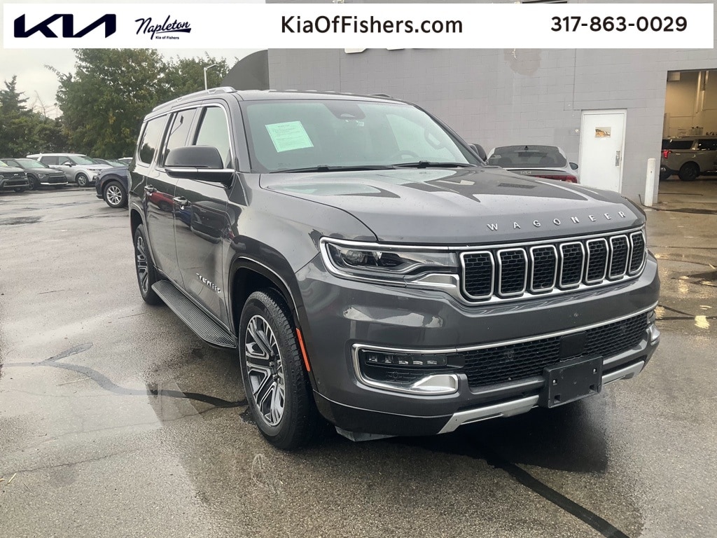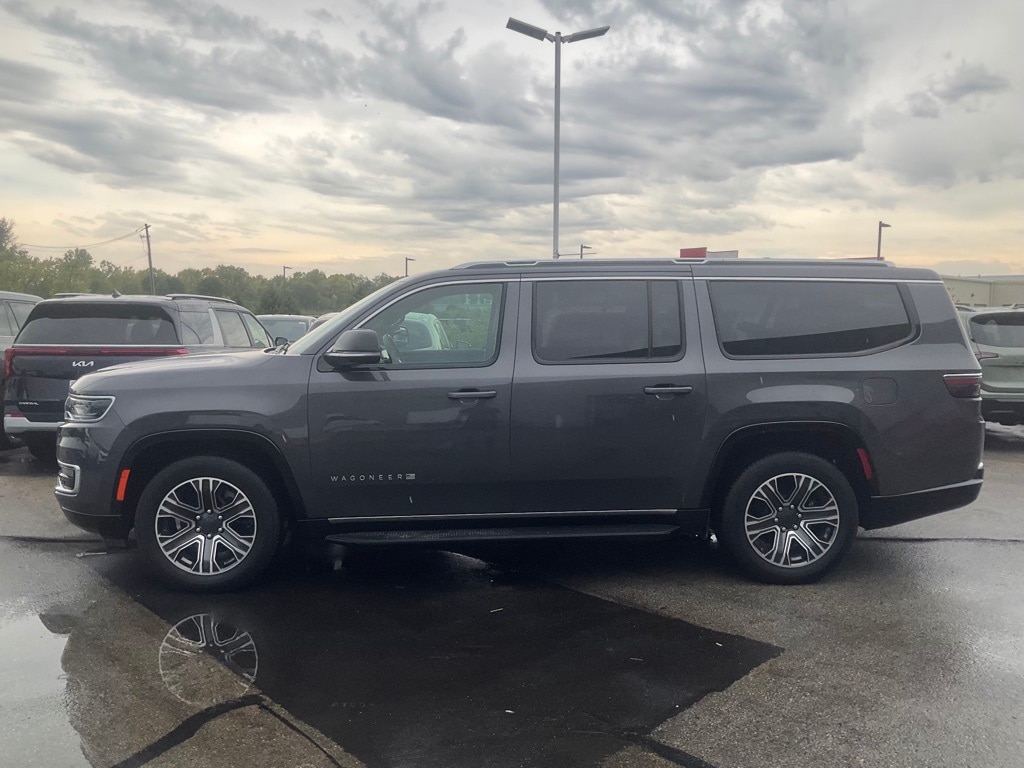 This Wagoneer L is well equipped with Quick Order Package 25J, Wagoneer L Series II, 4D Sport Utility, 3.0L I6, 8-Speed Automatic, 4WD, Baltic Gray Metallic Clearcoat, Black Leather, 10 Speakers, 3.55 Rear Axle Ratio, 3rd row seats: bench, 4-Wheel Disc Brakes, ABS brakes, Adjustable pedals, Air Conditioning, Alloy wheels, AM/FM radio: SiriusXM with 360L, Anti-whiplash front head restraints, Apple CarPlay/Android Auto, Audio memory, Auto-dimming door mirrors, Auto-dimming Rear-View mirror, Auto-leveling suspension, Automatic temperature control, Brake assist, Bumpers: body-color, Compass, Delay-off headlights, Driver door bin, Driver vanity mirror, Driver's Seat Mounted Armrest, Dual front impact airbags, Dual front side impact airbags, Electronic Stability Control, Emergency communication system: Wagoneer Connect, Exterior Parking Camera Rear, Four wheel independent suspension, Front anti-roll bar, Front Bucket Seats, Front Center Armrest w/Storage, Front dual zone A/C, Front fog lights, Front reading lights, Full Length Floor Console, Fully automatic headlights, Garage door transmitter, Genuine wood console insert, Genuine wood dashboard insert, Genuine wood door panel insert, Heated door mirrors, Heated front seats, Heated steering wheel, Illuminated entry, Knee airbag, Leather Trimmed Bucket Seats, Low tire pressure warning, Memory seat, Navigation System, Normal Duty Suspension, Occupant sensing airbag, Outside temperature display, Overhead airbag, Overhead console, Panic alarm, Passenger door bin, Passenger seat mounted armrest, Passenger vanity mirror, Pedal memory, Power adjustable front head restraints, Power door mirrors, Power driver seat, Power Liftgate, Power passenger seat, Power steering, Power windows, Radio data system, Radio: Uconnect 5 Nav w/10.1" Display, Rain sensing wipers, Rear air conditioning, Rear anti-roll bar, Rear reading lights, Rear seat center armrest, Rear window defroster, Rear window wiper, Reclining 3rd row seat, Remote keyless entry, Security system, Speed control, Speed-sensing steering, Speed-Sensitive Wipers, Split folding rear seat, Steering wheel memory, Steering wheel mounted audio controls, Tachometer, Telescoping steering wheel, Tilt steering wheel, Traction control, Trip computer, Turn signal indicator mirrors, Variably intermittent wipers, Ventilated front seats, Voltmeter, and Wheels: 20" x 9.0" Premium 2 Aluminum.