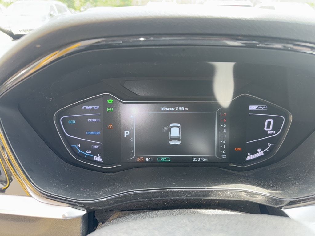 This Niro Plug-In Hybrid is well equipped with 1.6L 4-Cylinder DOHC 16V, 3.227 Axle Ratio, 4-Wheel Disc Brakes, 6 Speakers, ABS brakes, Air Conditioning, Alloy wheels, AM/FM radio: SiriusXM, Auto High-beam Headlights, Automatic temperature control, Bodyside moldings, Brake assist, Bumpers: body-color, Cloth & Leather Seat Trim, Delay-off headlights, Driver door bin, Driver vanity mirror, Dual front impact airbags, Dual front side impact airbags, Electronic Stability Control, Emergency communication system: UVO link 911 Connect, Exterior Parking Camera Rear, Four wheel independent suspension, Front anti-roll bar, Front Bucket Seats, Front Center Armrest, Front dual zone A/C, Front fog lights, Front reading lights, Fully automatic headlights, Heated door mirrors, Heated Front Bucket Seats, Heated front seats, Illuminated entry, Knee airbag, Leather Shift Knob, Low tire pressure warning, Occupant sensing airbag, Outside temperature display, Overhead airbag, Overhead console, Panic alarm, Passenger door bin, Passenger vanity mirror, Power door mirrors, Power driver seat, Power steering, Power windows, Radio: AM/FM/HD, Rear anti-roll bar, Rear seat center armrest, Rear window defroster, Rear window wiper, Remote keyless entry, Roof rack: rails only, Security system, Smart Key w/ Push Button and Remote Start, Speed control, Speed-sensing steering, Split folding rear seat, Spoiler, Steering wheel mounted audio controls, Tachometer, Telescoping steering wheel, Tilt steering wheel, Traction control, Trip computer, Turn signal indicator mirrors, Variably intermittent wipers, and Wheels: 16" Alloy w/Full Covers.