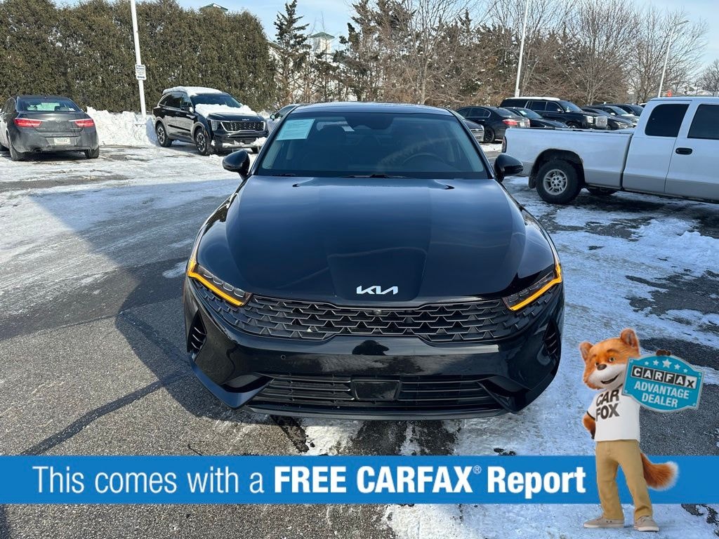 This K5 is well equipped with EX Premium Package (10-Way Power Passenger Seat, Active Sound Design, Auto Up/Down Rear Windows, Bose Premium Audio, Forward Collision Avoidance-Assist - Cyclist, Forward Collision Avoidance-Assist - Junction Turn, Heated Steering Wheel, LED Rear Combi Lamps, Memory Driver's Seat & Outside Mirrors, Navigation-Based Smart Cruise Control - Curve, Outside Mirrors w/LED Turn Signals, Parking Collision Avoidance-Assist - Reverse, Parking Distance Warning - Forward, Power Child Lock, Power Folding Outside Mirrors, Safe Exit Assist w/Lock, Smart Cruise Control w/Stop & Go, and Surround View Monitor), K5 EX, 4D Sedan, I4, 8-Speed Automatic, FWD, Ebony Black, Black w/Leatherette Seat Trim, Navigation System, Power moonroof, 4-Wheel Disc Brakes, 6 Speakers, ABS brakes, Air Conditioning, Alloy wheels, AM/FM radio: SiriusXM, Apple CarPlay & Android Auto, Auto High-beam Headlights, Automatic temperature control, Brake assist, Bumpers: body-color, Carpeted Floor Mats, Delay-off headlights, Driver door bin, Driver vanity mirror, Dual front impact airbags, Dual front side impact airbags, Electronic Stability Control, Emergency communication system, Four wheel independent suspension, Front anti-roll bar, Front Bucket Seats, Front Center Armrest, Front dual zone A/C, Front reading lights, Fully automatic headlights, Heated & Ventilated Front Bucket Seats, Heated door mirrors, Heated front seats, Illuminated entry, Knee airbag, Leatherette Seat Trim, Low tire pressure warning, Occupant sensing airbag, Outside temperature display, Overhead airbag, Overhead console, Panic alarm, Passenger door bin, Passenger vanity mirror, Power door mirrors, Power driver seat, Power steering, Power windows, Radio data system, Radio: AM/FM/MP3 Audio System, Rear anti-roll bar, Rear reading lights, Rear seat center armrest, Rear side impact airbag, Rear window defroster, Remote keyless entry, Security system, Smart Key w/ Push Button and Remote Start, Speed control, Speed-sensing steering, Split folding rear seat, Steering wheel mounted audio controls, Tachometer, Telescoping steering wheel, Tilt steering wheel, Traction control, Trip computer, Variably intermittent wipers, Ventilated front seats, and Wheels: 7.5J x 18" Gray Machined Finish Alloy.