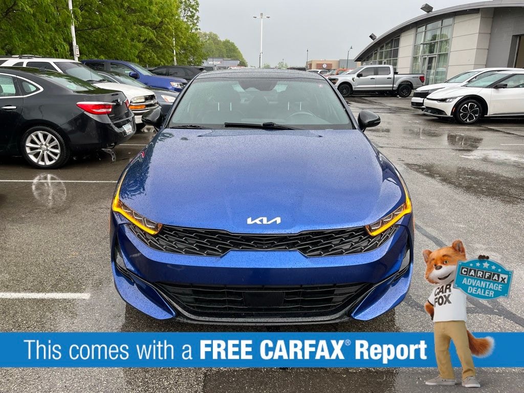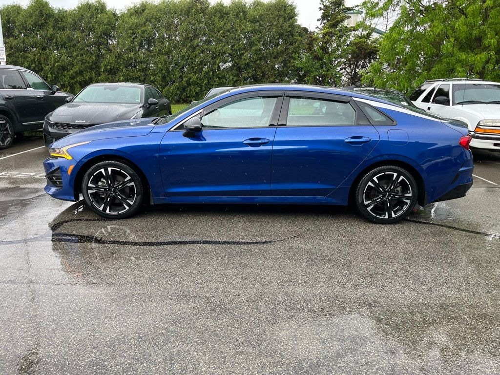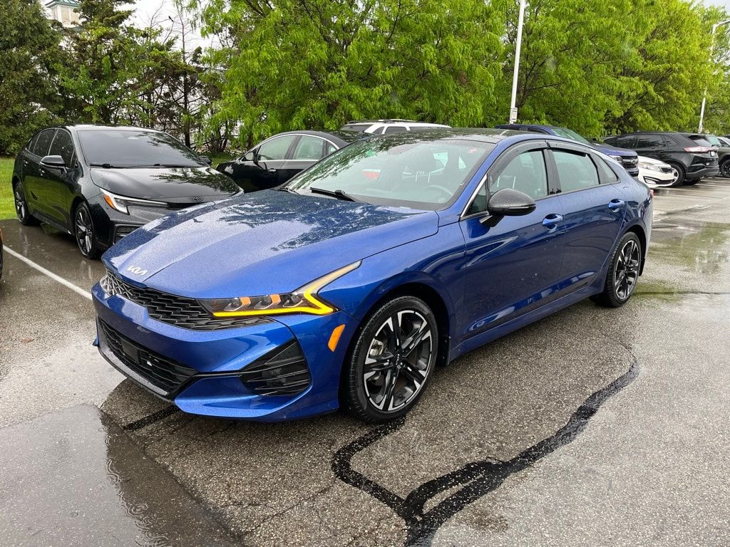 This K5 is well equipped with GT-Line Panoramic Sunroof Package (Gloss Black Pillar & Door Frame Cover, LED Interior Lighting, and Panoramic Sunroof), GT-Line Premium Package (Forward Collision Avoidance-Assist, Highway Driving Assist, LED Projection Headlamps, and Smart Cruise Control w/Stop & Go), K5 GT-Line, 4D Sedan, 1.6L I4 DGI Turbocharged DOHC 16V LEV3-ULEV70 180hp, 8-Speed Automatic, AWD, Sapphire Blue, Black w/SynTex Seat Trim, 4-Wheel Disc Brakes, 6 Speakers, ABS brakes, Air Conditioning, Alloy wheels, AM/FM radio: SiriusXM, Apple CarPlay & Android Auto, Auto High-beam Headlights, Automatic temperature control, Brake assist, Bumpers: body-color, Cargo Mat, Carpeted Floor Mats, Cloth/SynTex Seat Trim, Delay-off headlights, Driver door bin, Driver vanity mirror, Dual front impact airbags, Dual front side impact airbags, Electronic Stability Control, Four wheel independent suspension, Front anti-roll bar, Front Bucket Seats, Front Center Armrest, Front dual zone A/C, Front fog lights, Front reading lights, Fully automatic headlights, Heated door mirrors, Heated Front Bucket Seats, Heated front seats, Heated steering wheel, Illuminated entry, Knee airbag, Low tire pressure warning, Mud Guards, Navigation System, Occupant sensing airbag, Outside temperature display, Overhead airbag, Overhead console, Panic alarm, Passenger door bin, Passenger vanity mirror, Power door mirrors, Power driver seat, Power steering, Power windows, Radio data system, Radio: AM/FM/MP3 Audio System, Rear anti-roll bar, Rear seat center armrest, Rear side impact airbag, Rear window defroster, Remote keyless entry, Security system, Speed control, Speed-sensing steering, Split folding rear seat, Spoiler, Sport steering wheel, Steering wheel mounted audio controls, Tachometer, Telescoping steering wheel, Tilt steering wheel, Traction control, Trip computer, Turn signal indicator mirrors, Variably intermittent wipers, and Wheels: 18" Gloss Black Machined Finish Alloy.