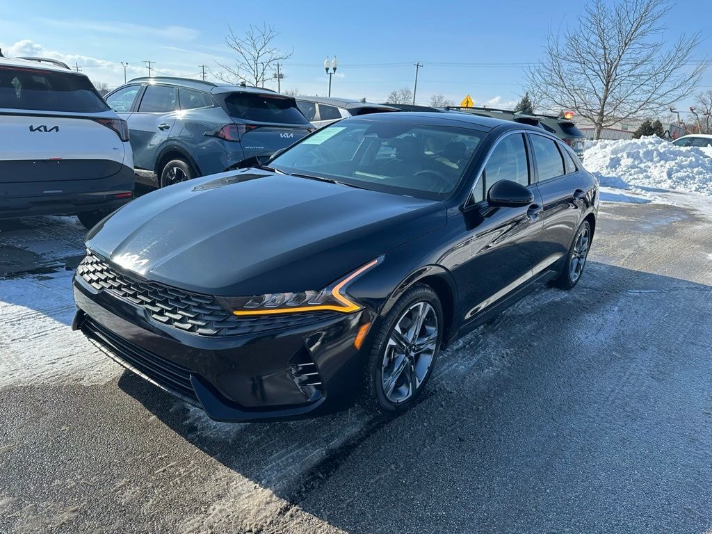 This K5 is well equipped with K5 EX, 4D Sedan, 1.6L I4 DGI Turbocharged DOHC 16V LEV3-ULEV70 180hp, 8-Speed Automatic, FWD, Ebony Black, Black w/SynTex Seat Trim, Power moonroof, 4-Wheel Disc Brakes, 6 Speakers, ABS brakes, Air Conditioning, Alloy wheels, AM/FM radio: SiriusXM, Apple CarPlay & Android Auto, Auto High-beam Headlights, Automatic temperature control, Brake assist, Bumpers: body-color, Cargo Mat, Carpeted Floor Mats, Delay-off headlights, Driver door bin, Driver vanity mirror, Dual front impact airbags, Dual front side impact airbags, Electronic Stability Control, Emergency communication system, Four wheel independent suspension, Front anti-roll bar, Front Bucket Seats, Front Center Armrest, Front dual zone A/C, Front reading lights, Fully automatic headlights, Heated & Ventilated Front Bucket Seats, Heated door mirrors, Heated front seats, Illuminated entry, Knee airbag, Low tire pressure warning, Navigation System, Occupant sensing airbag, Outside temperature display, Overhead airbag, Overhead console, Panic alarm, Passenger door bin, Passenger vanity mirror, Power door mirrors, Power driver seat, Power steering, Power windows, Radio data system, Radio: AM/FM/MP3 Audio System, Rear anti-roll bar, Rear reading lights, Rear seat center armrest, Rear side impact airbag, Rear window defroster, Remote keyless entry, Security system, Smart Key w/ Push Button and Remote Start, Speed control, Speed-sensing steering, Split folding rear seat, Steering wheel mounted audio controls, SynTex Seat Trim, Tachometer, Telescoping steering wheel, Tilt steering wheel, Traction control, Trip computer, Variably intermittent wipers, Ventilated front seats, and Wheels: 18" Gray Machined Finish Alloy.