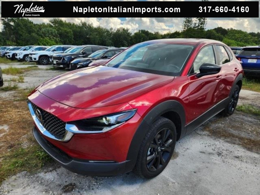 This Mazda CX-30 is well equipped with AppLink/Apple CarPlay and Android Auto, Front Bucket Seats, Leatherette Seat Trim, MAZDA CONNECT Infotainment System, 4-Wheel Disc Brakes, 4.095 Axle Ratio, 6 Speakers, ABS brakes, Air Conditioning, Alloy wheels, AM/FM radio, Auto High-beam Headlights, Automatic temperature control, Brake assist, Bumpers: body-color, Compass, Delay-off headlights, Driver door bin, Driver vanity mirror, Dual front impact airbags, Dual front side impact airbags, Electronic Stability Control, Emergency communication system: Mazda Connected Services (3-year complimentary trial included), Exterior Parking Camera Rear, Front anti-roll bar, Front Center Armrest, Front dual zone A/C, Front reading lights, Front wheel independent suspension, Fully automatic headlights, Heated door mirrors, Illuminated entry, Knee airbag, Leather Shift Knob, Leather steering wheel, Low tire pressure warning, Occupant sensing airbag, Outside temperature display, Overhead airbag, Overhead console, Panic alarm, Passenger door bin, Passenger vanity mirror, Power door mirrors, Power steering, Power windows, Radio data system, Radio: AM/FM Audio System, Rain sensing wipers, Rear seat center armrest, Rear side impact airbag, Rear window defroster, Rear window wiper, Remote keyless entry, Roof Rail Credit, Soul Red Crystal Metallic Paint Charge, Speed control, Speed-sensing steering, Split folding rear seat, Spoiler, Steering wheel mounted audio controls, Tachometer, Telescoping steering wheel, Tilt steering wheel, Traction control, Trip computer, Turn signal indicator mirrors, Variably intermittent wipers, and Wheels: 18" x 7J Aluminum Alloy.