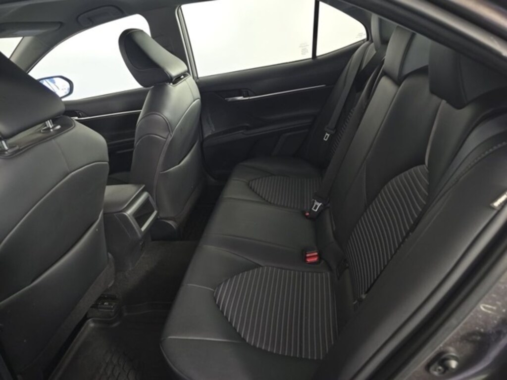 This Camry is well equipped with Black Artificial Leather, 4-Wheel Disc Brakes, 6 Speakers, ABS brakes, Air Conditioning, Alloy wheels, AM/FM radio: SiriusXM, Apple CarPlay/Android Auto, Auto High-beam Headlights, Automatic temperature control, Brake assist, Bumpers: body-color, Delay-off headlights, Driver door bin, Driver vanity mirror, Dual front impact airbags, Dual front side impact airbags, Electronic Stability Control, Emergency communication system: Safety Connect (1-year trial), Exterior Parking Camera Rear, Four wheel independent suspension, Front anti-roll bar, Front Bucket Seats, Front Center Armrest, Front dual zone A/C, Front reading lights, Fully automatic headlights, Heated door mirrors, Illuminated entry, Knee airbag, Leather steering wheel, Low tire pressure warning, Occupant sensing airbag, Outside temperature display, Overhead airbag, Overhead console, Panic alarm, Passenger door bin, Passenger vanity mirror, Power door mirrors, Power driver seat, Power steering, Power windows, Radio data system, Radio: Audio, Rear anti-roll bar, Rear seat center armrest, Rear side impact airbag, Rear window defroster, Remote keyless entry, Security system, Speed control, Speed-sensing steering, Split folding rear seat, Spoiler, Sport SofTex Seat Trim w/Fabric Inserts, Steering wheel mounted audio controls, Tachometer, Telescoping steering wheel, Tilt steering wheel, Traction control, Trip computer, Turn signal indicator mirrors, and Variably intermittent wipers.